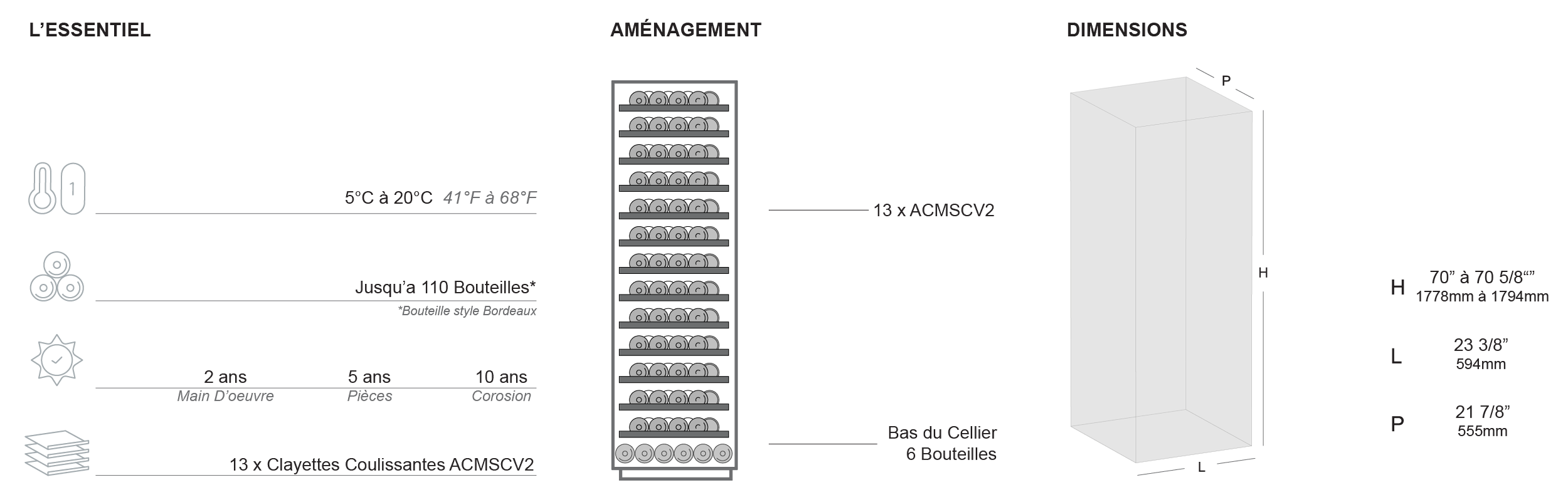 Équipé d’une régulation électronique stable, d’un contrôle adapté de l’humidité, d’une protection anti-UV et d’un système anti-vibrations, il garantit un environnement optimal pour la conservation et la maturation des vins.
